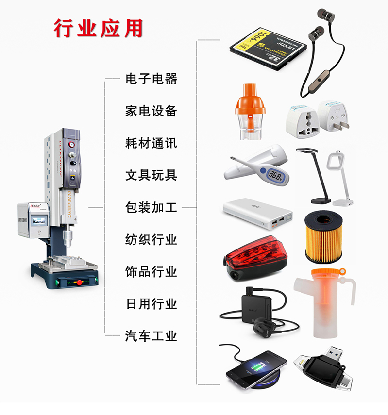 通過表格內(nèi)容,我們可以清晰的看出,南方力勁高端超聲波塑料焊接機可應用在多個行業(yè)多個領域,真正的實現(xiàn)一機多用,提高使用效率!