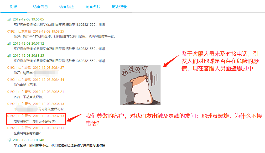 12月,是一個承前啟后的月份,在這個月份里,大家都開始準備總結(jié)過去一年的成績,檢查過去一年工作的完成情況,規(guī)劃新的一年工作計劃與目標。做為成立20多年的超聲波焊接標桿大廠南方力勁,這些常規(guī)的工作也在如火如荼的開展進行中,每個部門每個崗位每個人員,都要求在檢討中完善自己,提升自己。今天公司的電商部門在檢查客服接待工作時,就發(fā)現(xiàn)了因我們客服人員的疏忽,讓客戶對我們發(fā)出直擊靈魂深處的發(fā)問:地球沒爆炸,為什么不接電話?!