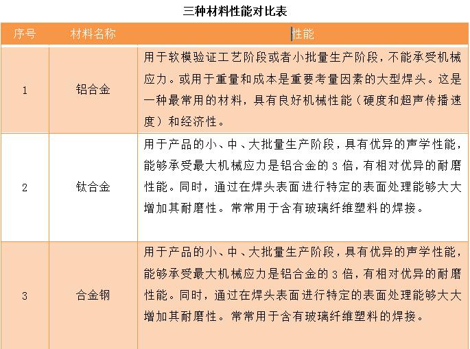 大多數(shù)情況下,主要應(yīng)用鋁合金、鈦合金以及合金鋼三種材料制造焊頭,因?yàn)檫@三種材料的性能各不相同,因此,在實(shí)際選材的過程中,要根據(jù)使用要求以及其他相關(guān)的因素綜合考量之后進(jìn)行選擇。三種材料性能對比如表所示: