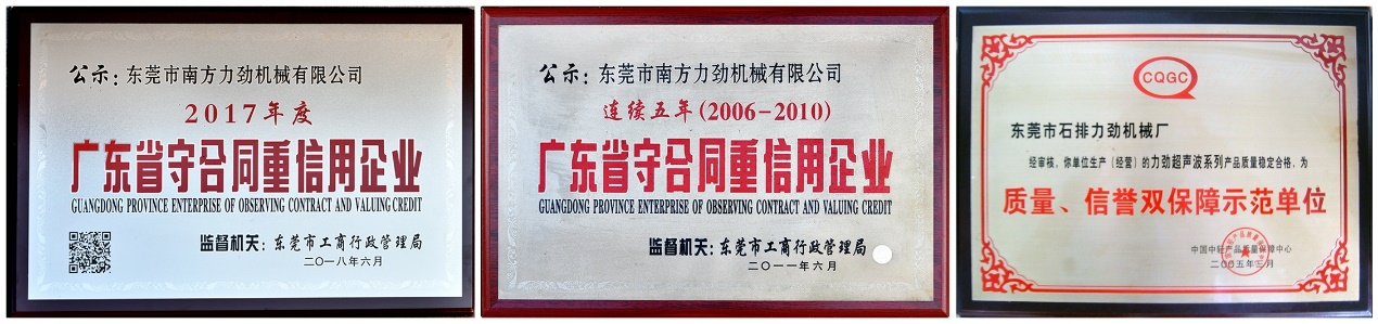 我們東莞市南方力勁機械有限公司創(chuàng)始人張總,一直強調(diào)并奉行,做生意和做人,都要一諾千金。公司自1998年成立以來,能成為國內(nèi)超聲波設備制造領域的標桿企業(yè),20余年來讓5000+客戶選擇我們,信任我們,也正是因為張總的一諾千金這種優(yōu)秀品質(zhì)已經(jīng)滲透到我們企業(yè)的骨子里。5000+客戶的選擇和多次復購,政府管理部門連續(xù)多年頌發(fā)“守合同重信用企業(yè)”的榮譽稱號,就是對我們南方力勁這種優(yōu)質(zhì)品質(zhì)的認可與褒揚。